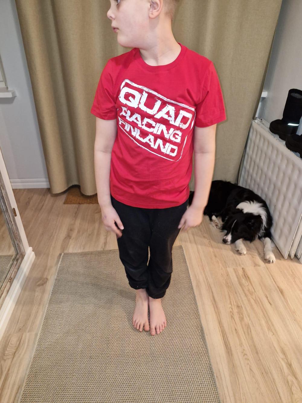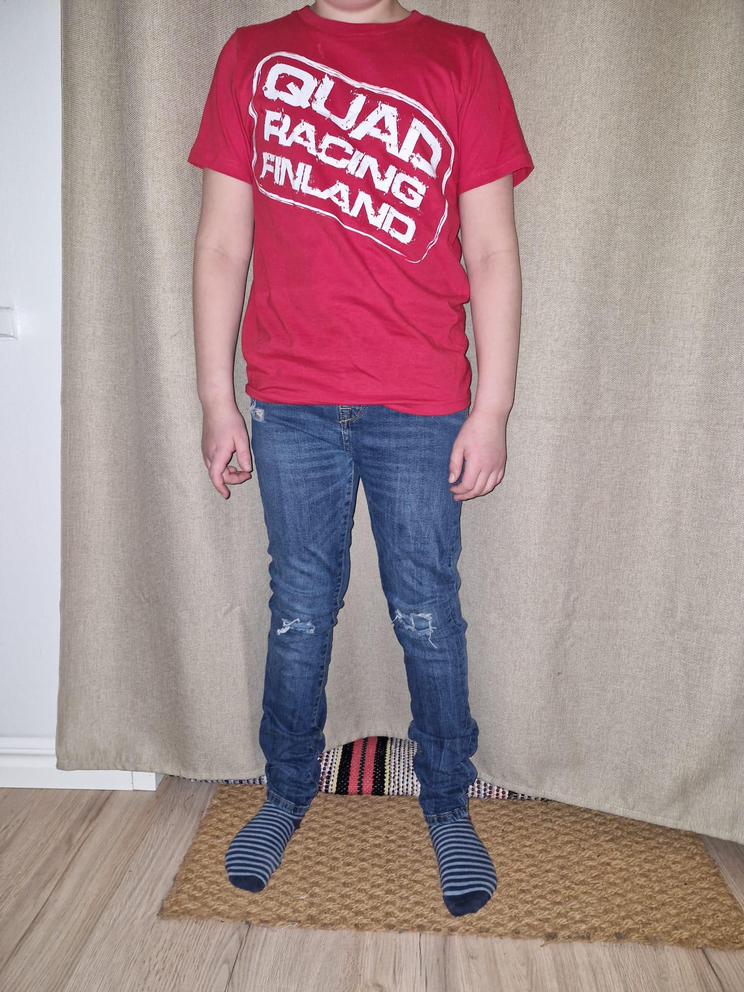 T-Paita => Vernerillä on yllään 152 senttiselle mitoitettu luomus joka vastaa pituutta melko tarkkaan, Ville on verhottu M kokoiseen, normaalisti L koko peittää 183cm / 80kg rankaa.